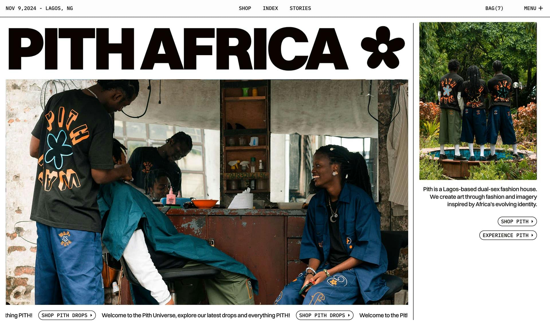 Pith is a Lagos-based, dual-sex fashion house with cult status in the Nigerian and African alternative scene. When they reached out to us for a storefront and digital diary, we knew a Shopify template wouldn’t cut it, so we set out to build a custom e-commerce platform.